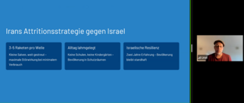 Anlass des Gespräches war der erneute Krieg mit dem Iran, der nur wenige Tage zuvor begonnen hatte. Uriel Kashi fasste die Ereignisse seit dem gemeinsamen Angriff der USA und Israels zusammen und ordnete die unübersichtliche Lage ein. Dabei ging er auf die Interessen der beteiligten Akteure ein, skizzierte die Ziele der Kriegsparteien und analysierte ihre Taktiken. So ungewiss der Ausgang des Konflikts auch sei, so betonte er, berge die aktuelle Situation zugleich die Möglichkeit, dass sich im Nahen Osten langfristig neue – vielleicht sogar friedlichere – Perspektiven eröffnen.