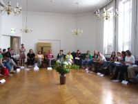Die 40 Teilnehmer haben in einem produktiven Tag die Entwicklungen, Fragen und Ergebnisse, die sich im ersten Durchlauf von Kom-Mit-Nadev gestellt haben, zusammengetragen. Dabei wurde sowohl erste Erfolge vermerkt, wie auch Anlaufschwierigkeiten des ersten Programmjahrs festgehalten. In einem intensiven, eintägigen Arbeitsprozess, in dem die Teilnehmer/innen sowohl in ihrer Gruppe, als auch nach unterschiedlichen Themenfeldern gruppiert zusammen arbeiteten, wurden positiven Erfahrungen, aber auch konkrete Veränderungswünsche formuliert sowie Themen zur weiteren Auseinandersetzung und Entwicklung dokumentiert.