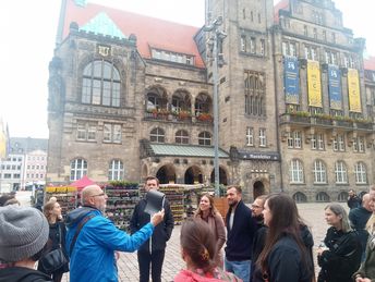 Begegnungen vor Ort. Einen Höhepunkt des Diskursprojekts stellten persönliche Begegnungen dar, die Einblicke in jüdisches Leben in Deutschland vermitteln konnten. Mit Uwe Dziuballa, Betreiber der deutsch-israelisch-jüdischen Begegnungsstätte und des koscheren Restaurants „Schalom“ war eine lokale Stimme aus Chemnitz vertreten. Mit der Gruppe teilte er seine bewegte Lebensgeschichte und seine Erfahrungen im Umgang mit antisemitischen Übergriffen. Durch sein humorvolles und mutiges Auftreten baute er Berührungsängste ab und beantwortete offene Fragen.