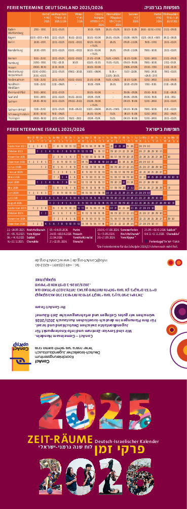 ConAct veröffentlicht jeweils im September einen deutsch-israelischen Jahreskalender im Taschen-Faltformat, der sowohl die deutschen als auch die israelischen Feiertage und Ferientermine enthält. Der Kalender ist bei ConAct kostenlos erhältlich und wird auf Wunsch – gern auch zum Weitergeben – verschickt. Bitte melden Sie sich bei uns telefonisch oder per E-Mail.