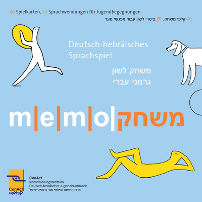 Memo-Mizchak ist eine deutsch-hebräische Variante des bekannten Sprachkartenspiels mit Karten in großem Format (15 x 15 cm). Die 40 illustrierten Karten bilden Paare – je eine Karte ist auf Deutsch, die andere auf Hebräisch beschriftet; auch für eine Umschrift ins jeweils andere Schriftsystem ist gesorgt. Auf ihnen stehen Fragen wie: „Worum geht’s?“ oder „Hilfst du mir?“ und Aussagen wie „Kein Problem“ oder „Macht nichts“.