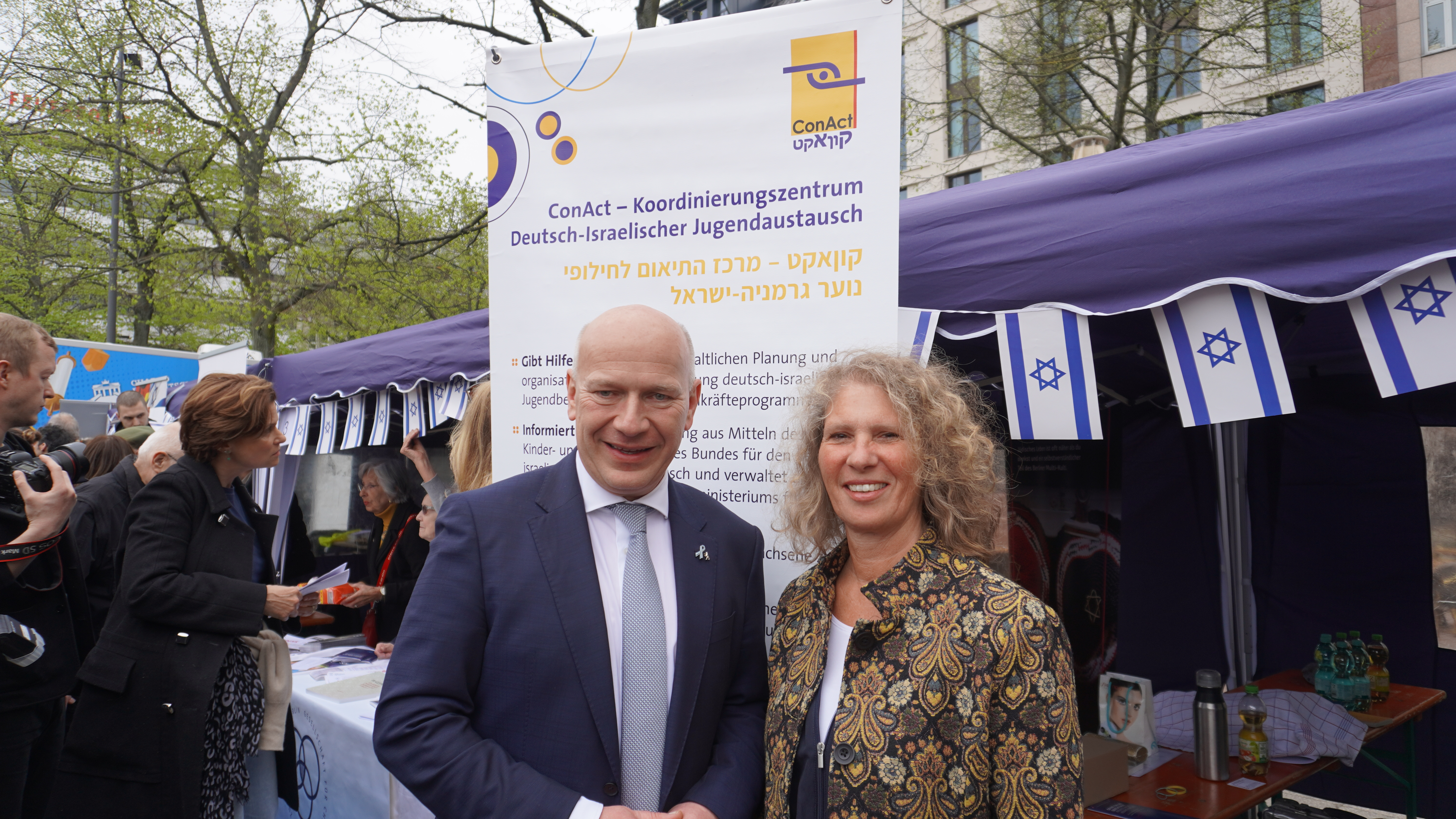 Die Veranstaltung war gut besucht – und auch am Infostand von ConAct kamen etliche Besucher*innen zusammen, um sich über Austausch- und Begegnungsangebote für junge Menschen in Israel und Deutschland zu informieren und in den pädagogischen Materialien zu stöbern. Einer von ihnen war der neugewählte Regierende Bürgermeister von Berlin, Kai Wegner, der sich bei der Leitung von ConAct, Christine Mähler, zu den aktuellen Entwicklungen im Deutsch-Israelischen Jugendaustausch erkundigte. Auch Aaron Sagui, Gesandter der Botschaft des Staates Israel, war am ConAct-Stand vor Ort, um sich ein Bild von der Arbeit des Koordinierungszentrums zu machen.